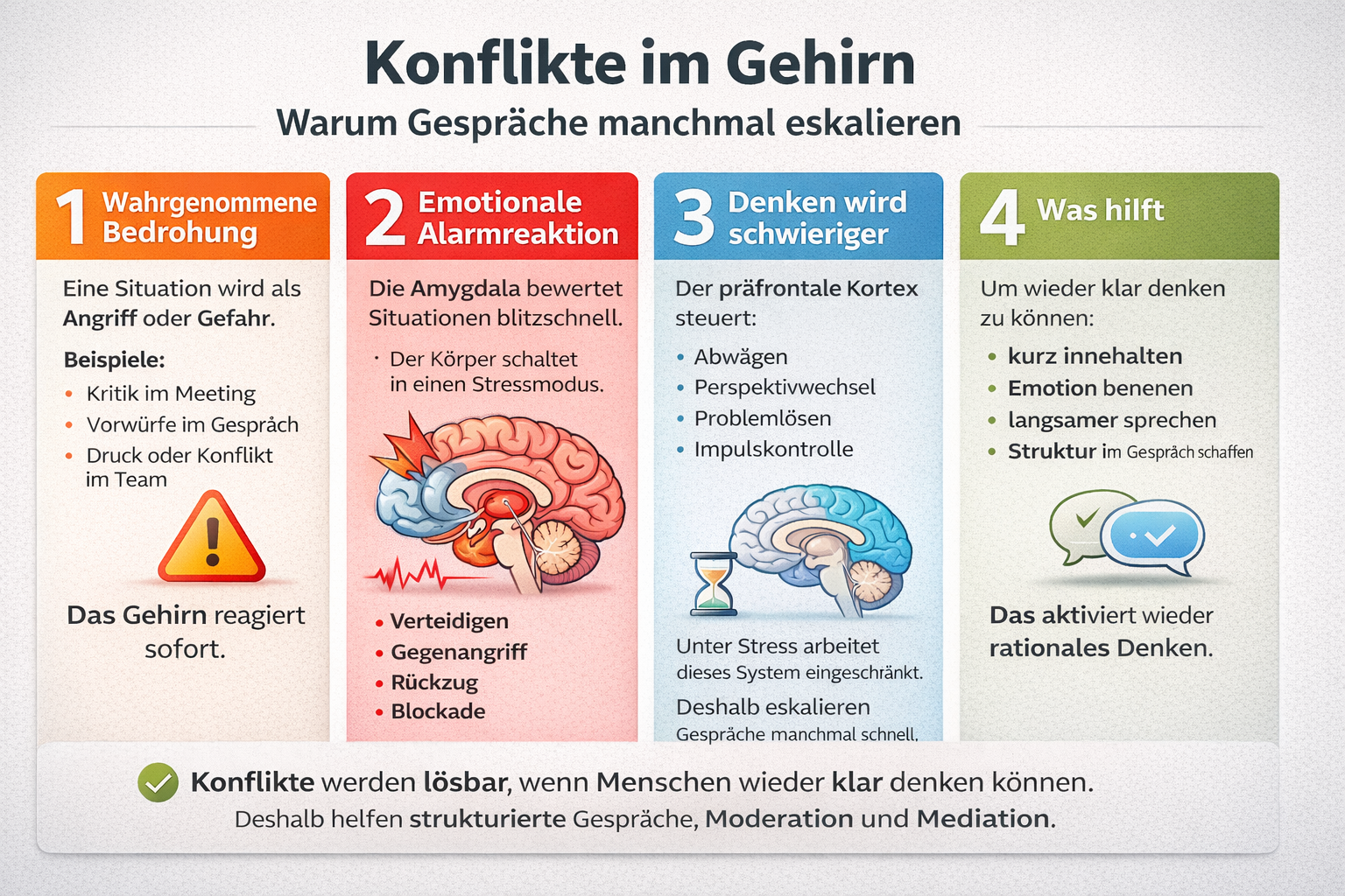 Konflikte lassen sich daher nicht allein durch inhaltliche Klärung lösen. Wer Konflikte professionell begleiten möchte, benötigt ein Verständnis dafür, was in solchen Situationen bei Menschen geschieht, und muss in der Lage sein, Rahmenbedingungen zu schaffen, die auch unter emotionaler Spannung tragfähig bleiben.